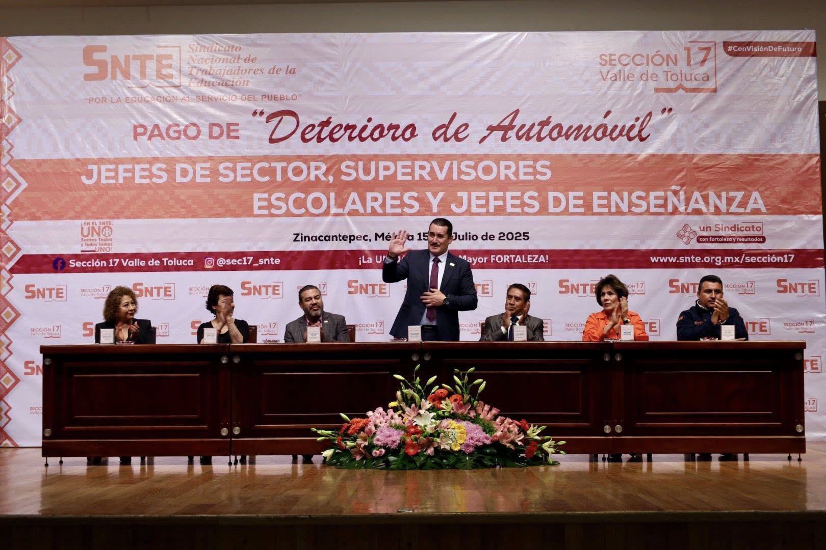 En un acto de compromiso y reconocimiento al trabajo en campo que realizan los líderes educativos, el Secretario General de la Sección 17 del SNTE, Prof. José Alfredo Geraldo Benoit, encabezó la entrega del pago correspondiente al concepto de deterioro de automóvil a jefes de sector, supervisores escolares y jefes de enseñanza.